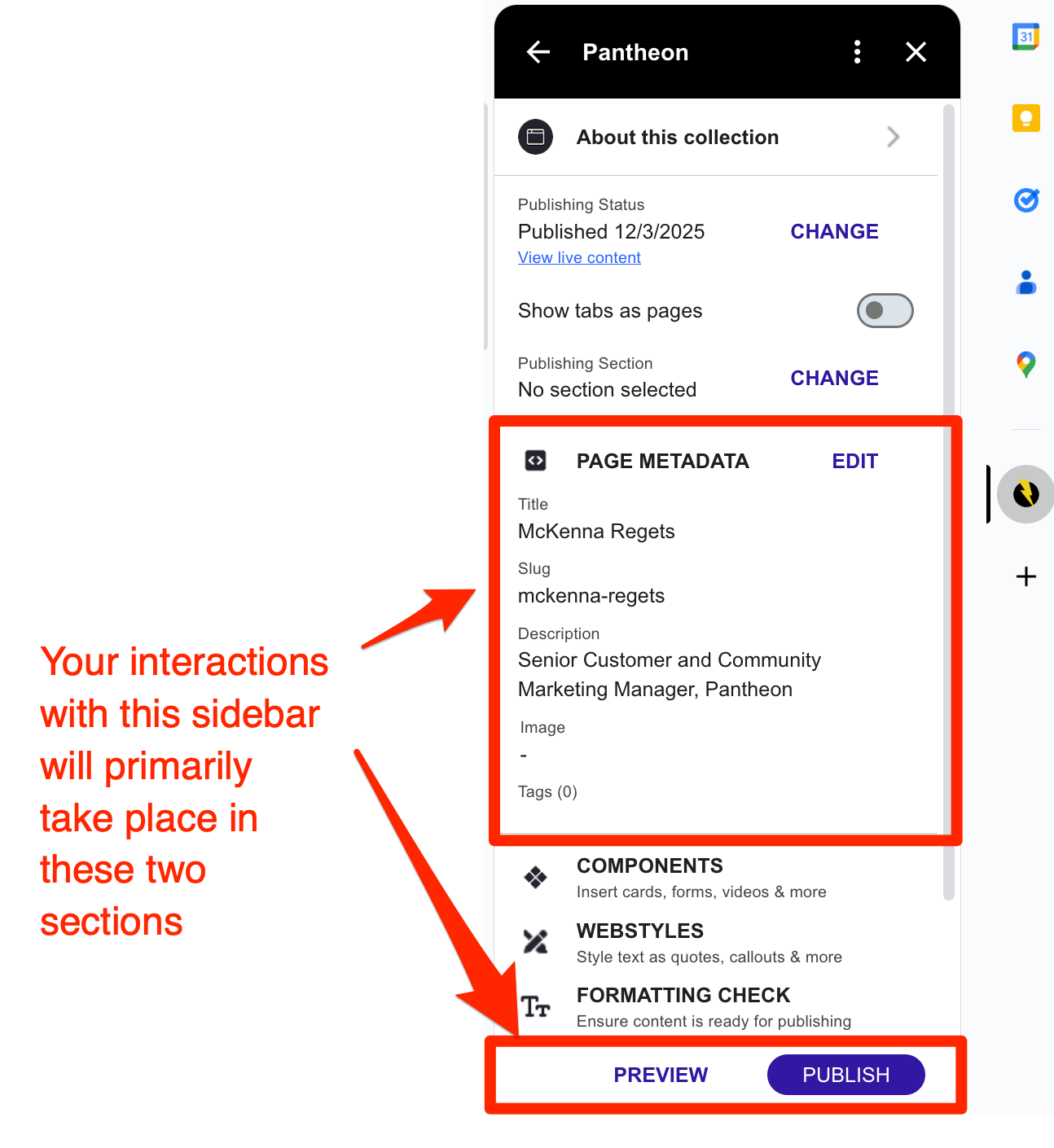 - Click the Pantheon Content Publisher icon in the right sidebar (it appears as a column of icons).